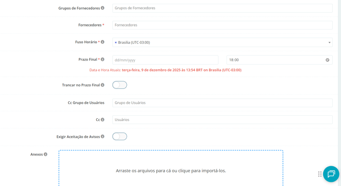- Fuso Horário: Selecione o seu fuso horário. Ele será convertido para o horário dos demais fornecedores que estejam com outro fuso cadastrado.