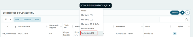 Em "Solicitações de Cotação BID", clique em "Criar Solicitação de Cotação" e selecione o modal "Rodoviário FTL".
