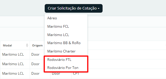 Se esse modal rodoviário não aparece para você no botão "Criar Solicitação de Cotação", entre em contato com o CS responsável pela sua conta para verificar se o seu contrato inclui esse módulo.