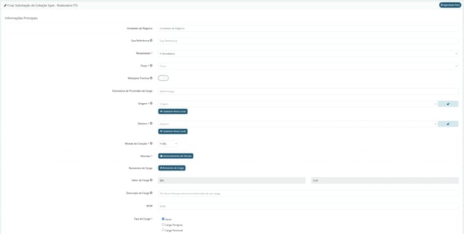 Será aberto um formulário para preencher detalhes da cotação. Note que os campos com asterisco (*) vermelho são de preenchimento obrigatório. Contudo, recomendamos preencher o máximo de informações possíveis para facilitar a resposta do provedor logístico.