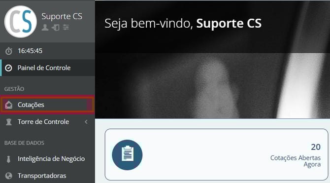 No menu lateral esquerdo, identifique a seção "Gestão" e clique no botão "Cotações".