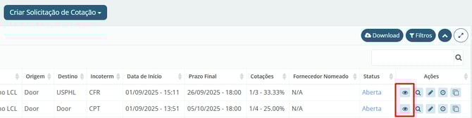 Em seguida, localize a cotação que terá seu prazo alterado. Clique no ícone de olho no canto direito da tela, "Detalhes".