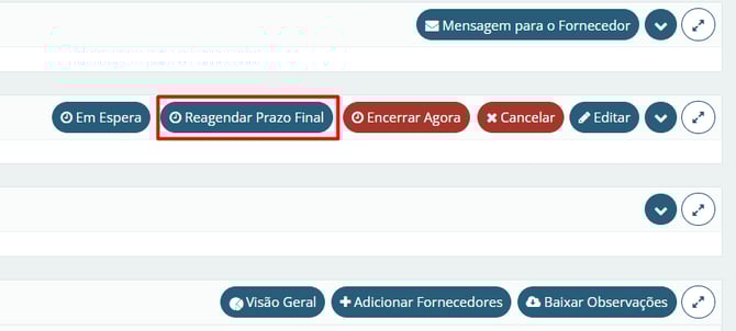 Ao entrar na cotação, localize na tabela Cotação, e em seguida o botão laranja de Reagendar Prazo Final.