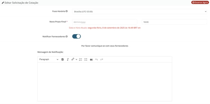 Você será redirecionado para a página onde poderá editar o prazo. Neste local, altere o campo "Novo Prazo Final" para a data e horário desejados. Além disso, você poderá optar por notificar os fornecedores sobre o reagendamento do prazo final.