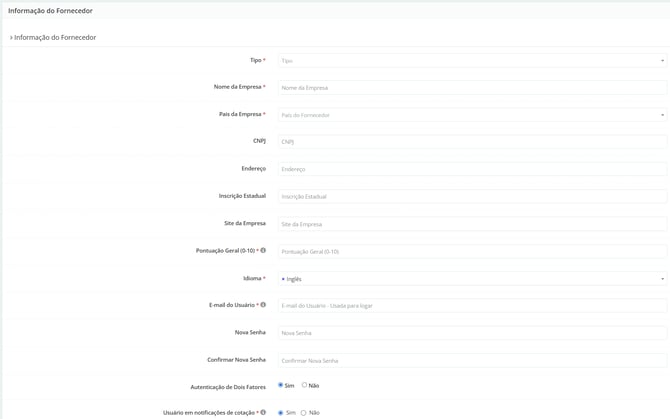 - País da Empresa: país onde a empresa está localizada. Essa informação é importante para que, caso você precise cadastrar o mesmo fornecedor em diferentes países, o sistema possa identificá-lo de forma diferente e evitar confusões.