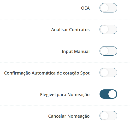 - Usuário em notificações de cotação: defina se a conta principal do provedor logístico deve receber notificações do sistema, que incluem abertura de cotações, alterações de prazos, nomeações para rotas e outras atualizações relevantes.