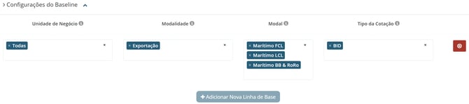 Na aba "Configurações de baseline" você irá identificar esse fornecedor como baseline, ou seja, devem ser aplicadas somente aos provedores logísticos que você utilizava anteriormente na Cargo Sapiens. Nesse processo, é possível organizá-los conforme as unidades de negócio, modalidades, modais ou tipos de cotação. Clique aqui para entender melhor sobre Saving.