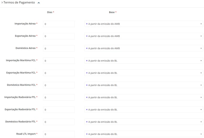 No que se refere ao prazo de pagamento, o sistema apresentará essa informação durante a análise das propostas, permitindo que você utilize o prazo negociado com o provedor logístico como critério estratégico na tomada de decisão. Adicionalmente, no momento do cadastro do provedor logístico é necessário informar em qual etapa do embarque a cobrança deverá ser realizada.