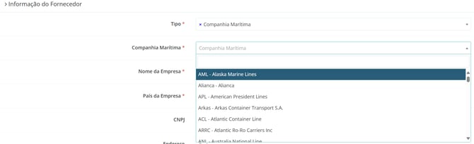 - Tipo: você deve indicar se o provedor logístico é um agente de carga, uma companhia marítima (armador) ou uma transportadora terrestre.