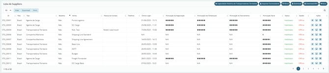 Em Suppliers List (Lista de Fornecedores), podemos observar, filtrar e criar Fornecedores, seja um a um ou em massa. Caso escolha criar em massa, clique em "Download" (Baixar) para baixar uma planilha de template, edite as informações no excel e a suba em "Upload Suppliers" (Importar Fornecedores) em seguida. Para um tutorial mais completo do cadastro individual, acesse o tutorial específico.