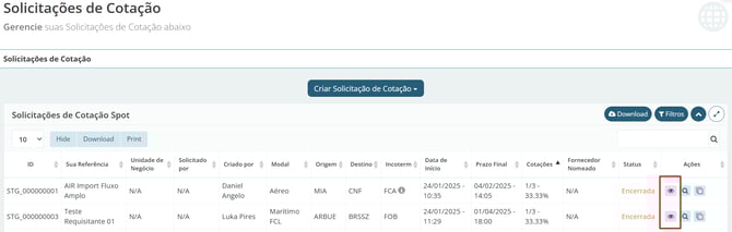 Encontre a cotação que deseja desabilitar uma oferta e clique no botão "Detalhes", representado pelo ícone de olhinho ao lado direito.