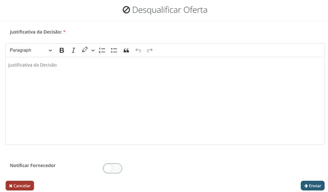 - Justificativa da Decisão: detalhe o motivo pelo qual você decidiu desclassificar essa oferta.