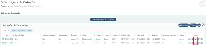 Em seguida, no canto direto da tabela de cotações, localize a cotação que você editará e clique no botão com o ícone de lápis.