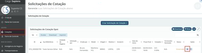 Clique em "Cotações" no menu lateral esquerdo e, em seguida, no botão de Detalhes representado pelo ícone de olho ao lado direito da cotação que deseja extrair o PDF.