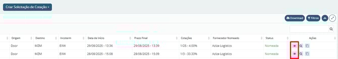Para verificá-lo, no menu lateral esquerdo, clique no botão "Cotações" e, em seguida, localize a cotação com status de Nomeado, clicando no botão com ícone de olho à direita, para visualizar os detalhes.