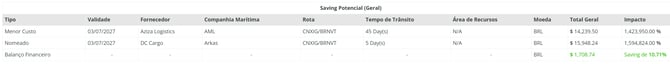 As tabelas seguintes mostrarão para você os savings ocorridos nessa nomeação. Caso a melhor oferta não tenha sido selecionada para essa rota, o sistema irá te mostrar quanto você poderia ter economizado caso você a tivesse escolhido.