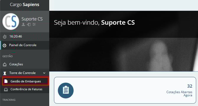 Identifique no menu lateral esquerdo a seção Gestão (em inglês, Management), e clique em Torre de Controle (em inglês, Control Tower). Em seguida, selecione a opção Gestão de Embarques (em inglês, Shipment Management).