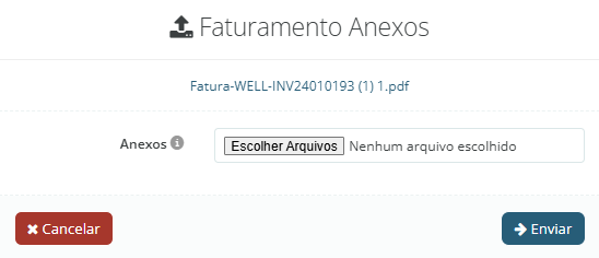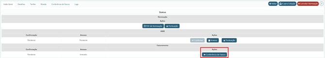 Dentro da cotação salva, clicando no botão Conferência de Fatura (em inglês, Invoices Conference), podemos verificar a fatura enviada pelo provedor logístico em Anexos (em inglês, Attachments).