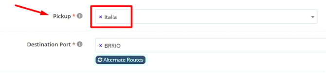 Now, regarding the filling out of the Pickup, in this example we will indicate Italy as the initial address, then passing through France, Spain and finishing in Portugal, the location from which it will depart from the port (FCL example).
