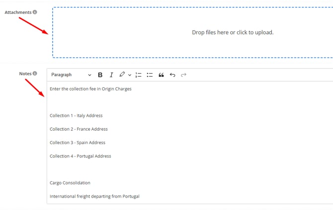 Regarding the other addresses, you must inform in the 'Notes' field all the information and guidance regarding the pickups for consolidation, as well as attach any existing documents in the 'Attachments' field, if necessary: