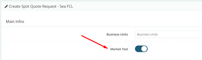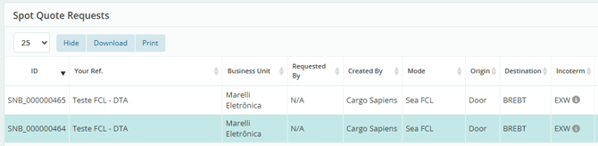 Once created, it will be identified as a Market Test by a blue background color when viewed in the general list under “Spot Quote Requests,” as shown below: