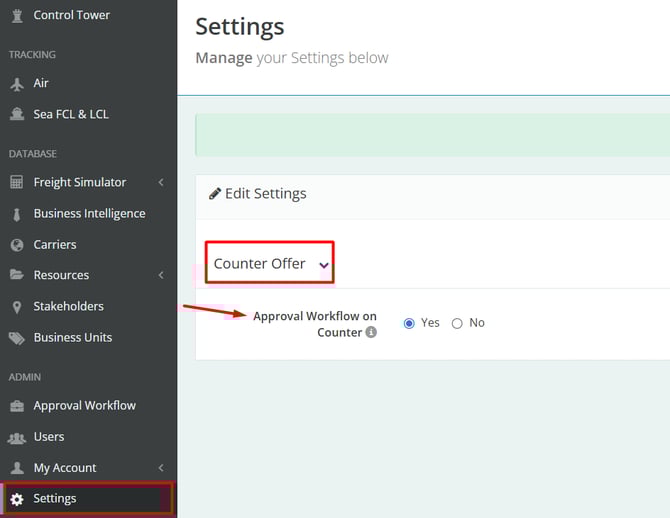 In the left-side menu, click on “Settings”. Then locate the “Counter offer” tab to enable the “Approval Workflow on Counter” option, or search in the top-right field of the screen.