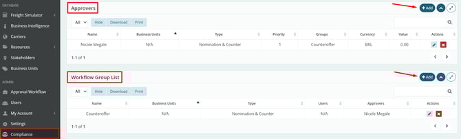 When returning to the Workflow Group List table, note that the Approver already appears correctly in the Approvers field, while the User field remains blank. This is expected: at this moment, the group has been created, but there are still no users linked to it.