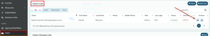 2. Locate the desired user and click the view icon (eye) in the Actions column.