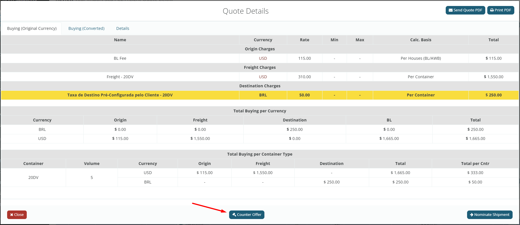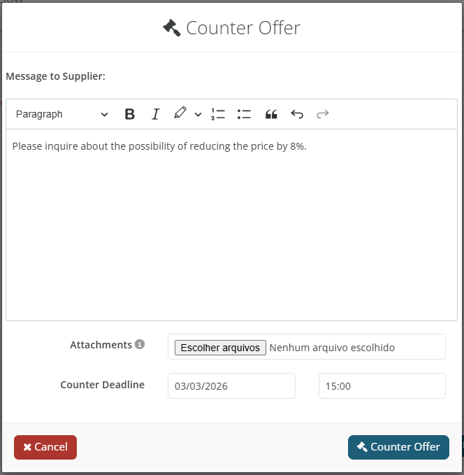 Then, click the “Counter Offer” button to send a message to the logistics provider negotiating and set a date and time for their response, as well as attach a document if necessary.