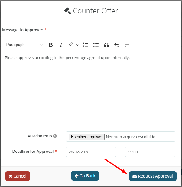 Immediately after, define a message to the Approver and set a date and time for the request, as well as attach a document if necessary.