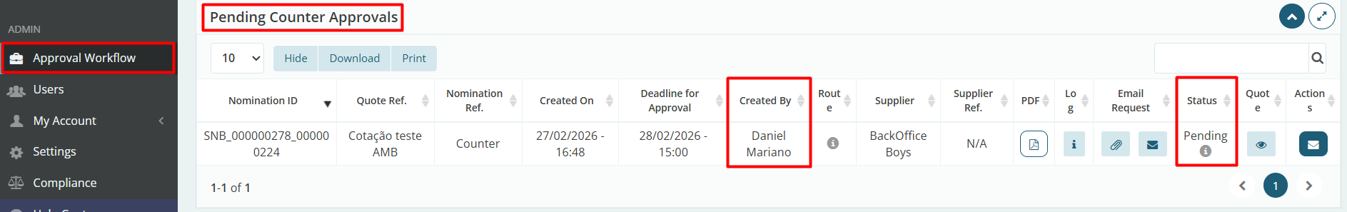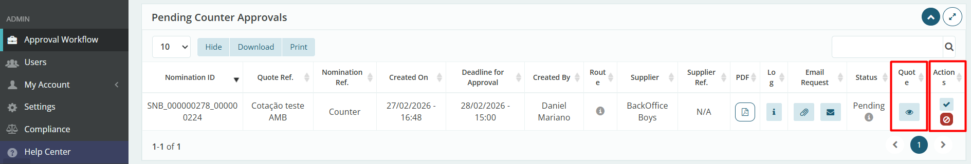 Finally, we will now see this same screen from the approver’s perspective, where they can access the quotation if necessary to review the details and then choose “Approve” or “Decline” by clicking the corresponding button in the “Actions” column.