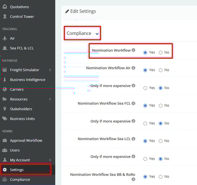 In the left sidebar menu, click on 'Settings'. Then, locate the 'Compliance' tab to enable the 'Nomination Approval Flow' option, or search in the field at the top right of the screen. It is necessary to enable the nomination approval flow by modal.