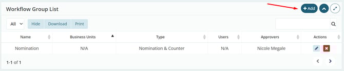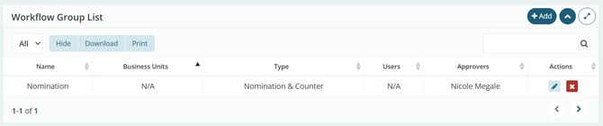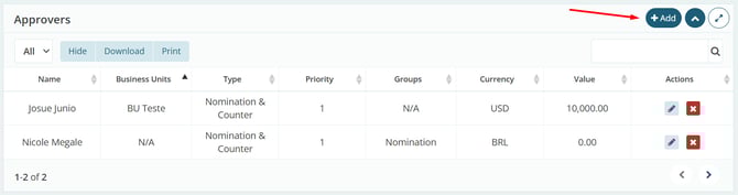 Next, in the 'Approvers' table, select the users who will have permission to approve or reject nominations. To include new responsible parties, click 'Add'.