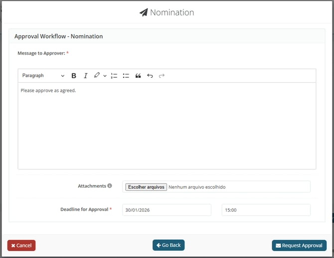 Finally, regardless of the choice, the approver will be directed to the final stage of the process, where there is a field to enter a message to the requesting user, justifying the decision. All this information is recorded in the Nomination Log.