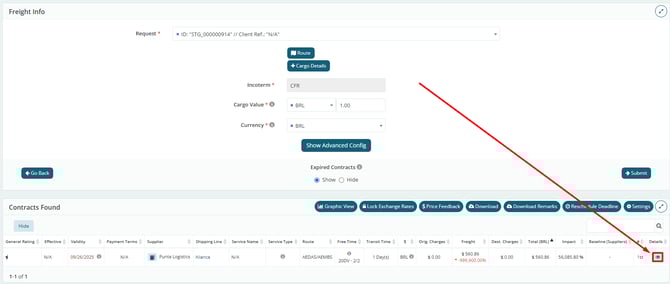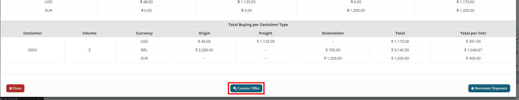 After confirming by clicking “Counter Offer”, the quotation is sent back to the carrier, who may or may not adjust the values. After the carrier’s response and the end of the response deadline, when analyzing the quotation, the new offer will be highlighted in green on the “Analyze Quotation” screen.