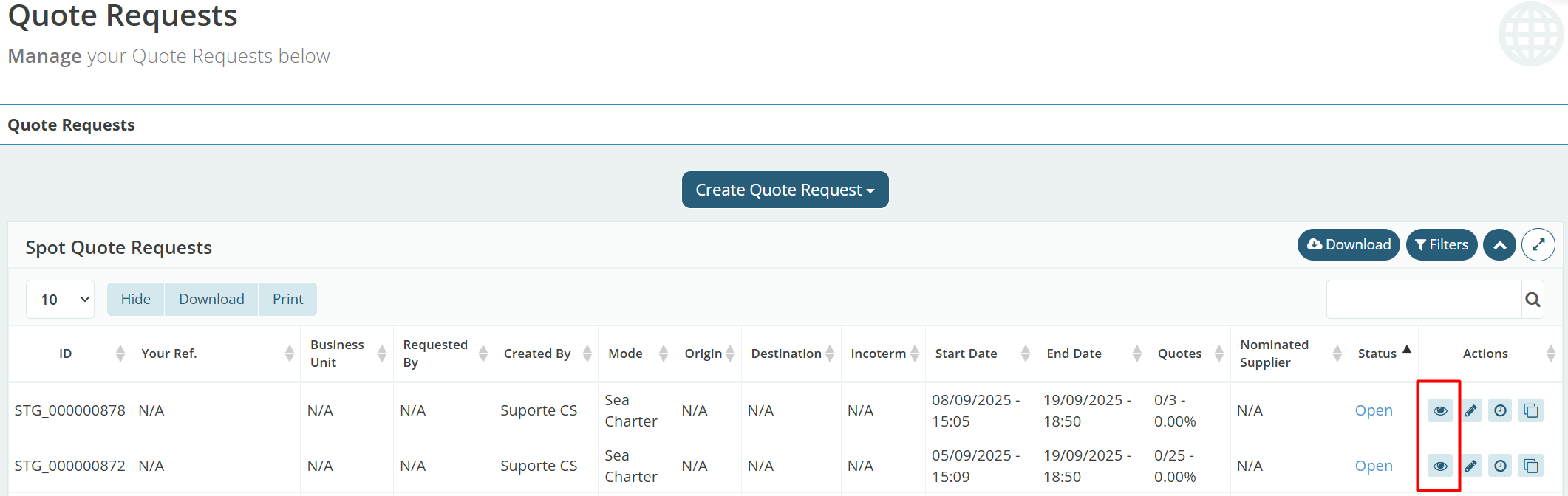 Click the 'Details' button represented by an eye icon on the right side of the SPOT quote you wish to cancel.