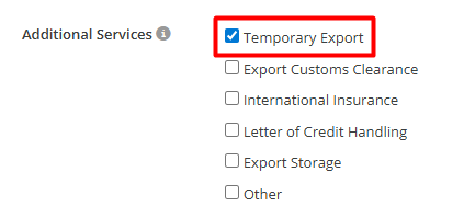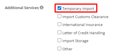 When you are on the SPOT quotation creation screen and fill in the fields “Mode” (Import or Export) and “Incoterm”, a new option will appear at the bottom of the page under “Additional Service”: “Temporary Export” or “Temporary Import.”