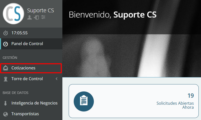 En el menú lateral izquierdo, identifique la sección Gestión y haga clic en el botón Cotizaciones.