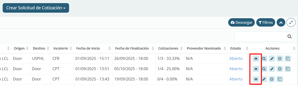 A continuación, localice la cotización cuyo plazo será modificado. Haga clic en el icono de ojo en la esquina derecha de la pantalla, Detalles.