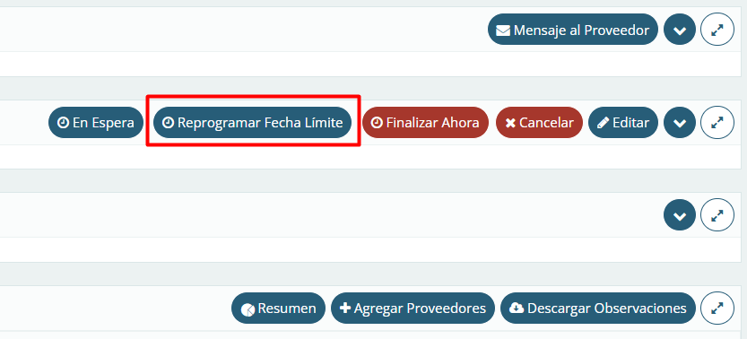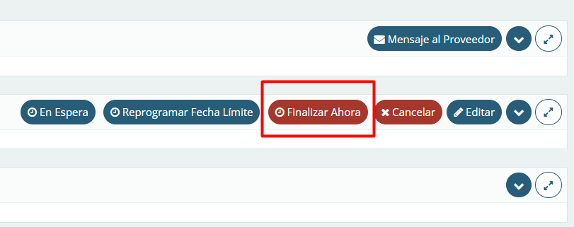 También es posible cerrar la cotización de inmediato utilizando la opción disponible en la esquina superior derecha de la pantalla principal de la cotización, sin necesidad de reprogramar la fecha límite. Como alternativa, haga clic en Reprogramar Fecha Límite y, a continuación, seleccione Finalizar ahora en el mismo lugar.