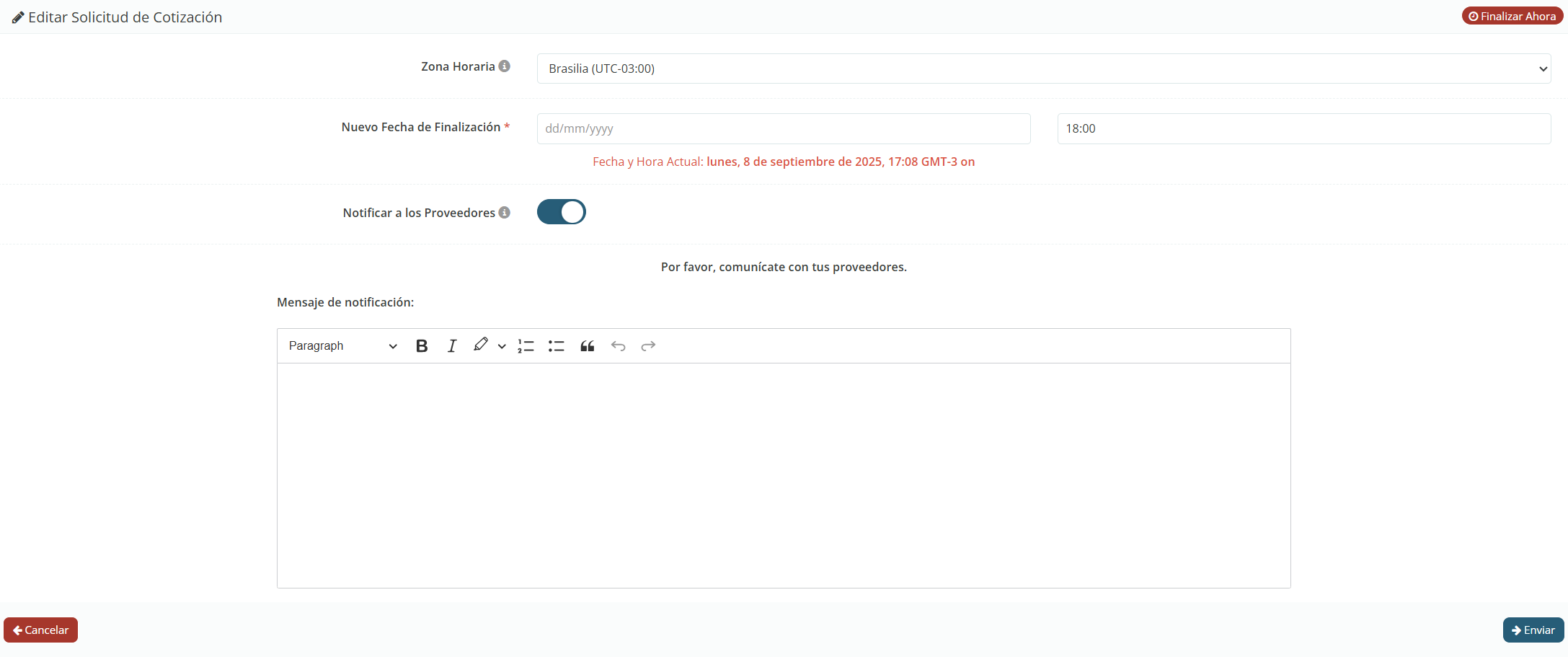 Será redirigido a una página donde podrá editar el plazo. En este apartado, modifique el campo Nuevo Fecha de Finalización (en inglés, New End Date) con la fecha y hora deseadas. Además, tendrá la opción de notificar a los proveedores sobre la reprogramación del plazo final.