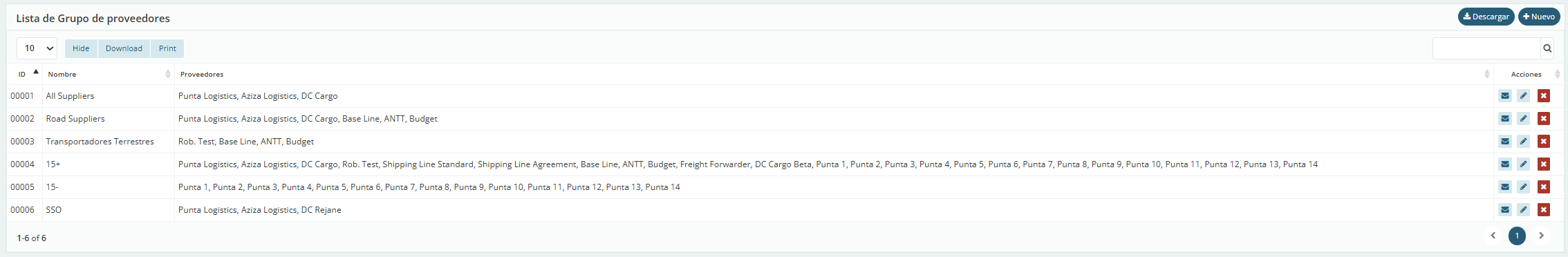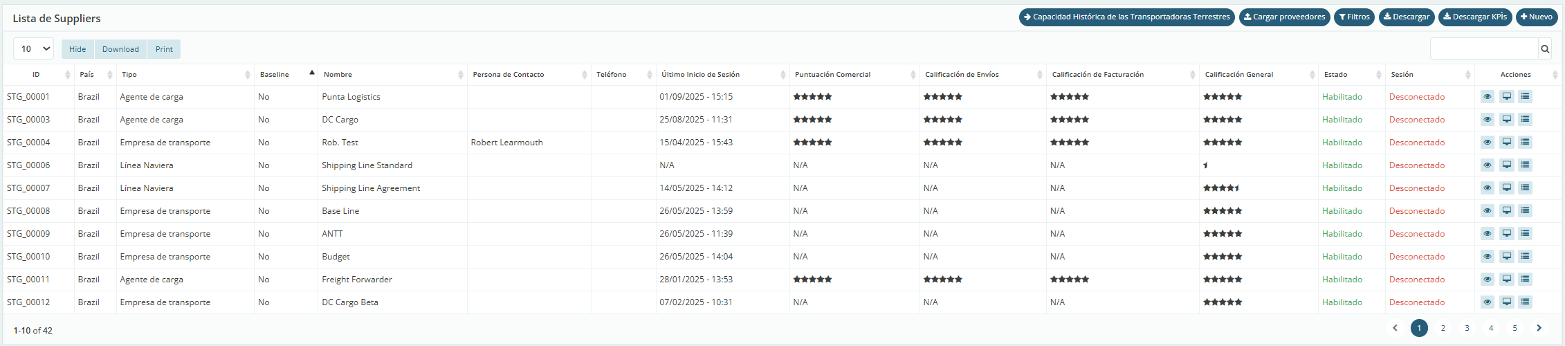 En el menú lateral izquierdo, haga clic en Transportistas para acceder a la página de gestión de proveedores. En esta pestaña, se puede acceder a la lista de proveedores logísticos y a la lista de Grupos de Fornecedores, además de poder enviar correos electrónicos a proveedores, de manera individual o masiva.