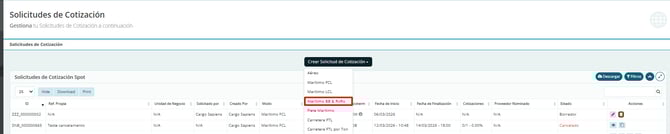 Luego, haga clic en “Crear Solicitud de Cotización” y seleccione el modal “Marítimo BB & RoRo”.