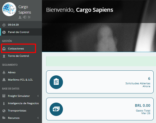 Acceda al sistema en el entorno donde desea abrir una cotización SPOT. Es importante destacar que cada cliente tiene un entorno exclusivo, lo que significa que todos los registros y la información generados en ese espacio son confidenciales y privados.