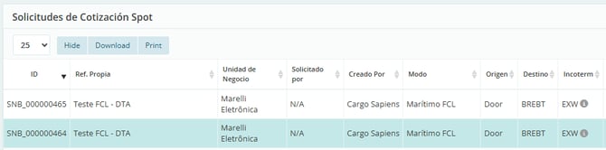 Una vez creada, será identificada como Market Test por el color azul de fondo al visualizarla en la lista general en “Solicitudes de Cotización Spot,” como se muestra a continuación:
