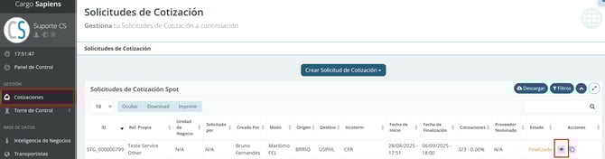 Haga clic en "Cotizaciones" en el menú lateral izquierdo y, a continuación, en el botón de Detalles representado por el ícono de ojo a la derecha de la cotización de la cual desea extraer el PDF.