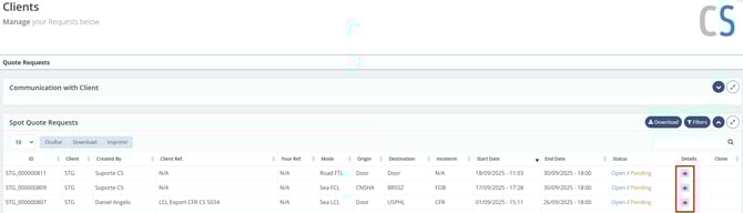 It is essential to highlight that, in order for you to respond to a SPOT quotation, its status must be set to “Open”, visible in the “Status” column next to the eye icon. If the quotation appears as “Closed”, this indicates that the deadline has already been reached.