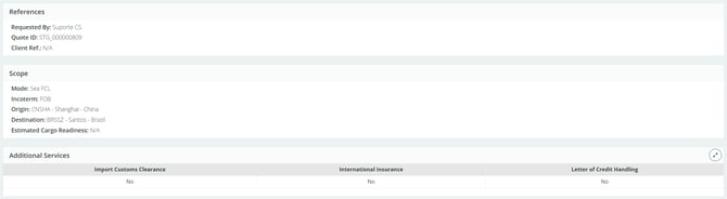 When you begin filling it out, the first three tabs will correspond to the scope of the quotation. There, you will be able to view the quotation details, such as Mode, Incoterm, Origin, Destination, Estimated Cargo Readiness, Required Quotation Validity, and whether additional services are needed, among others.