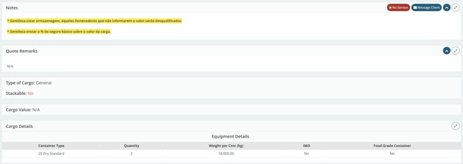 In the following five tabs, you will find additional information about the quotation, including the notes provided by the client, additional remarks, details about the type of cargo and its description, cargo details (Packing List), and the total cargo value.