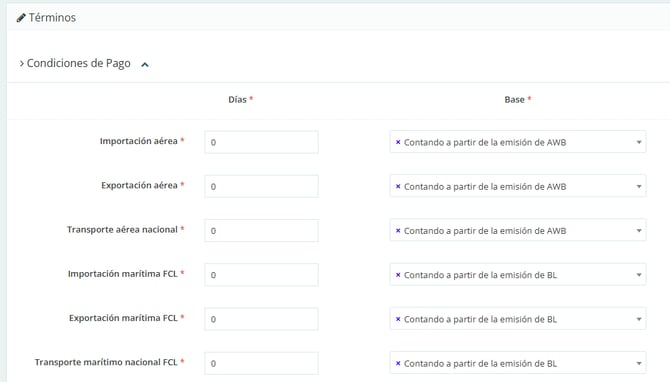 En ella, deberá introducir cuántos días naturales tiene el cliente para pagar, y en base a ello seleccionar a partir de qué momento del embarque comienza a contar este plazo: a partir de la emisión del BL, a partir de la emisión de la factura, a partir de la salida del lugar de carga y a partir de la llegada al lugar de descarga de la mercancía.